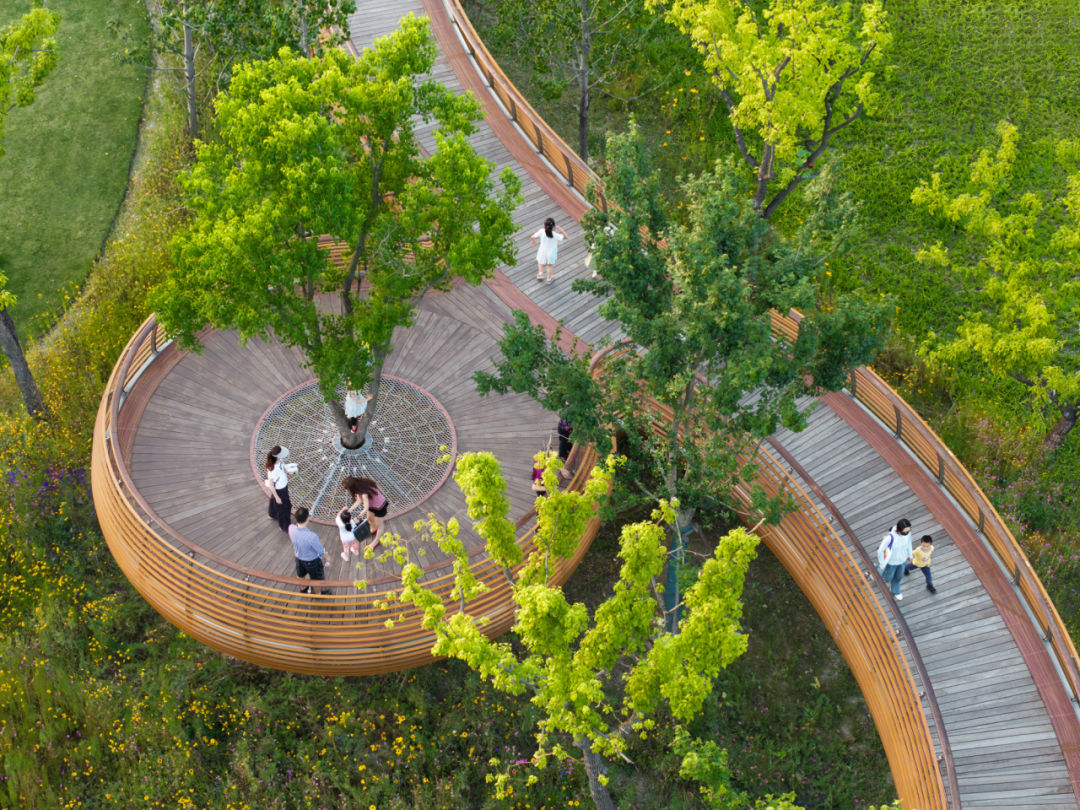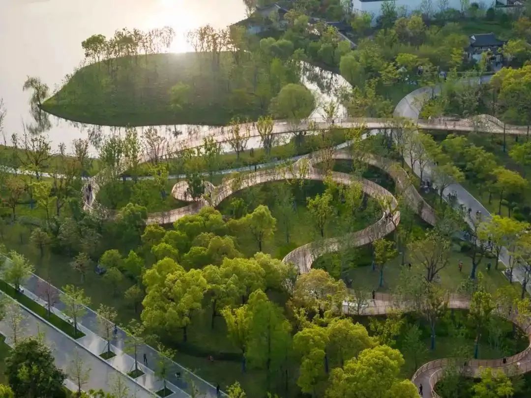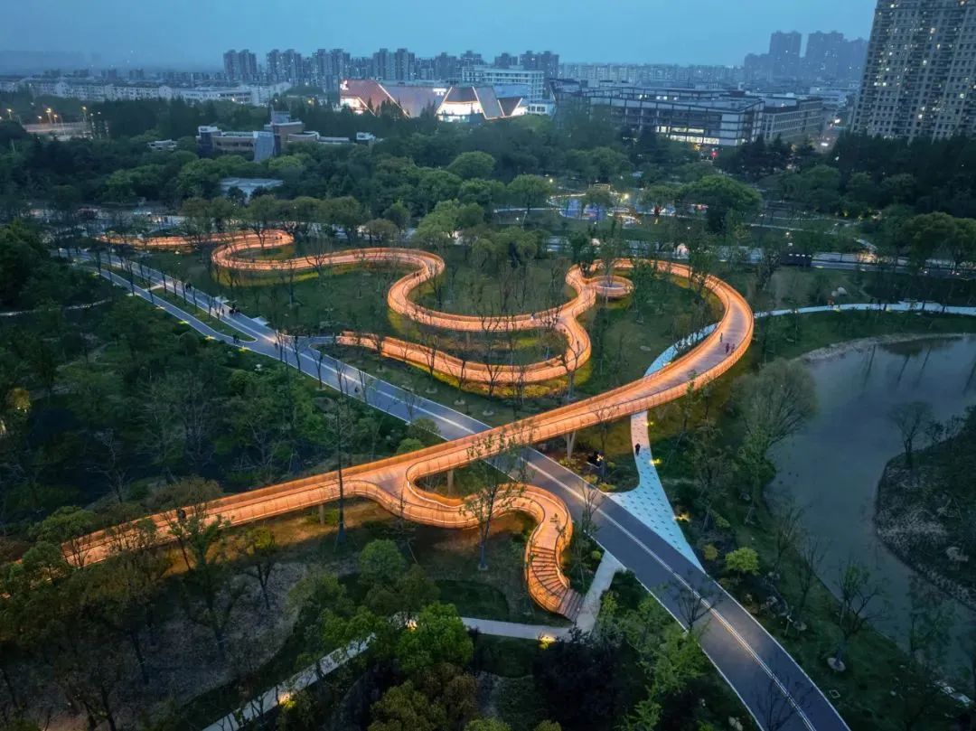 在设计过程中,设计团队以连接和消隐为侧重点,通过“漂浮的锦缎”这一独特设计,实现了公园东西向的大贯通。多维绿道如同城市的毛细血管,将绿地、商业街区、历史文化街区等公共空间紧密地连接起来,形成了一个连续、贯通的慢行网络。这一设计不仅丰富了城市的空间层次,还提升了公共空间的使用效率和可达性。