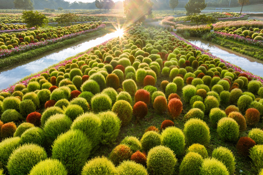 最近,沪郊花开海上生态园里,大片大片圆萌可爱的地肤红了,前往观赏游览的市民游客络绎不绝。