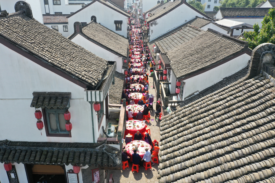 10月11日,重阳节,沪浙毗邻的两个山塘村携手举办“长街宴”,近300位老人围坐一堂共享“孝老、敬老”之乐……
