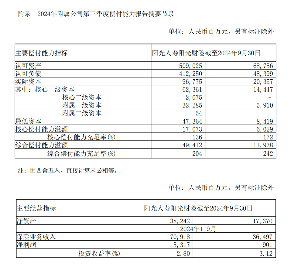10月28日,阳光保险发布附属公司截至2024年第三季度末之主要偿付能力等指标。