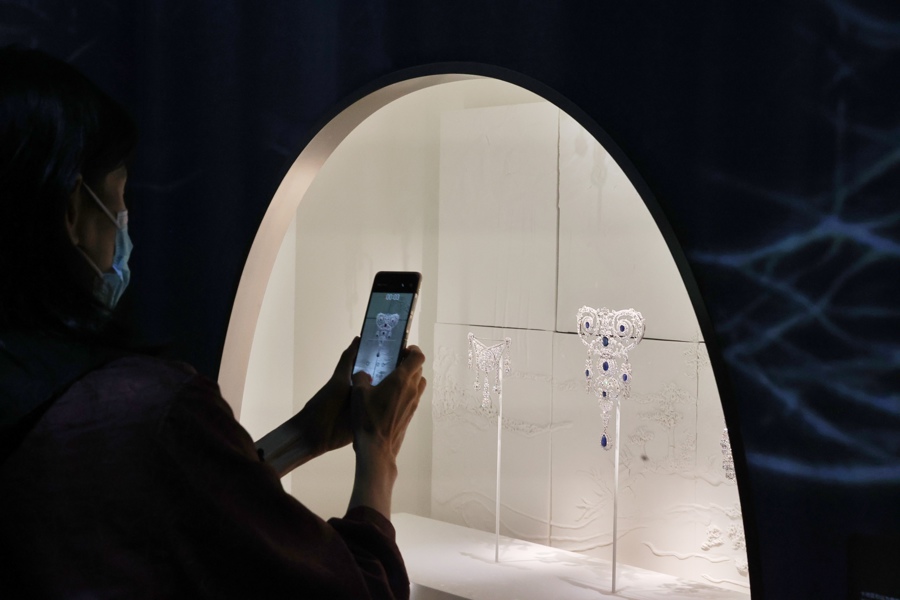 “满庭芳菲:卡地亚的艺术魔力”展上上博文物和卡地亚珠宝同框展陈。