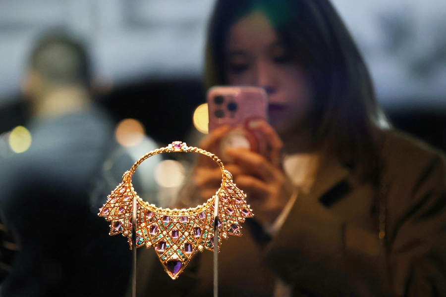 观众被“满庭芳菲:卡地亚的艺术魔力”展上展出的精美珠宝首饰吸引。