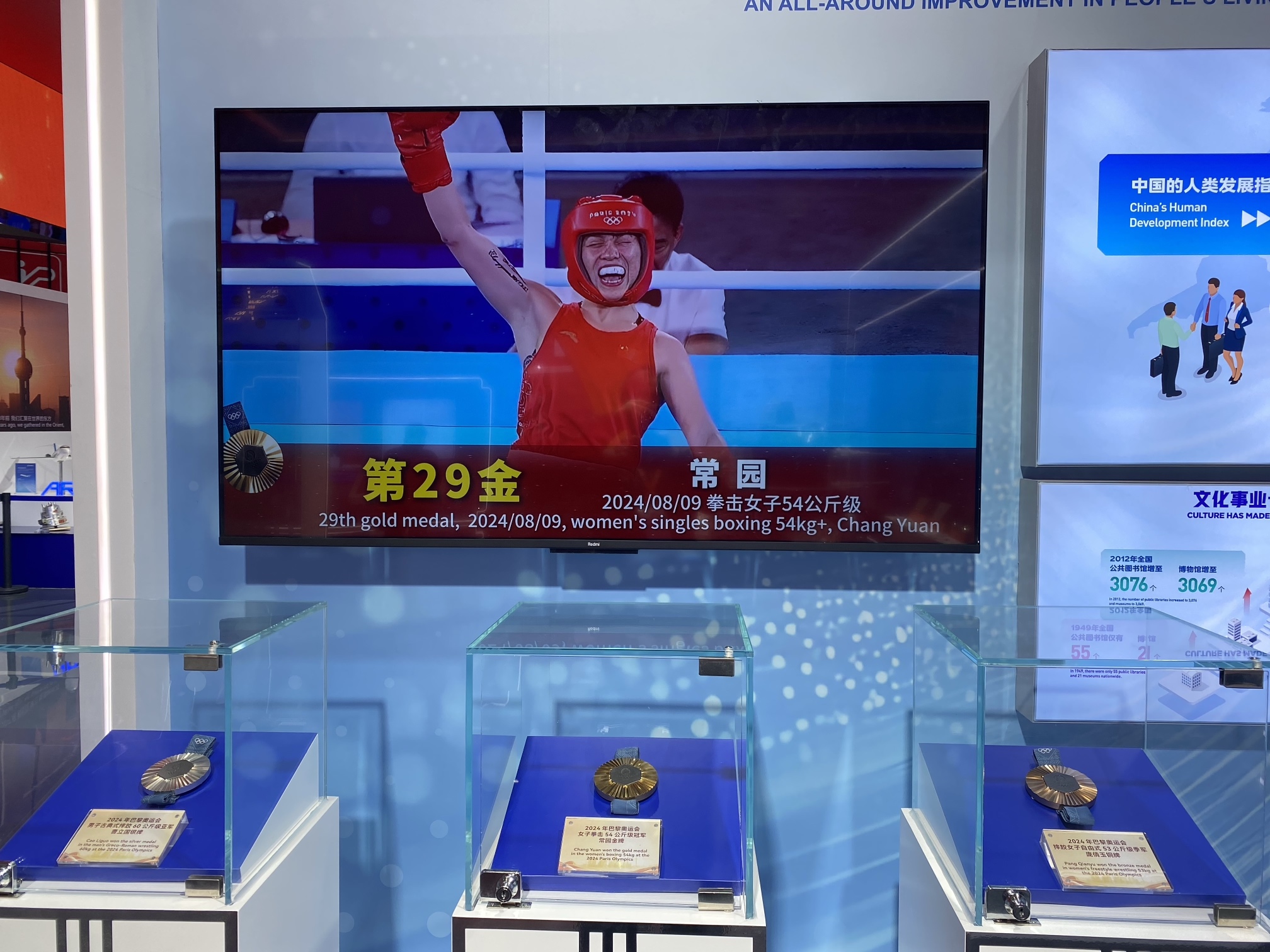 2024年巴黎奥运会女子拳击54公斤级冠军常园的金牌也在中国馆现场展出