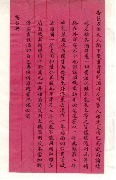 中国最早的葡萄酒酿造公司——张裕酿酒公司创始人张振勋致盛宣怀信件。主办方 供图