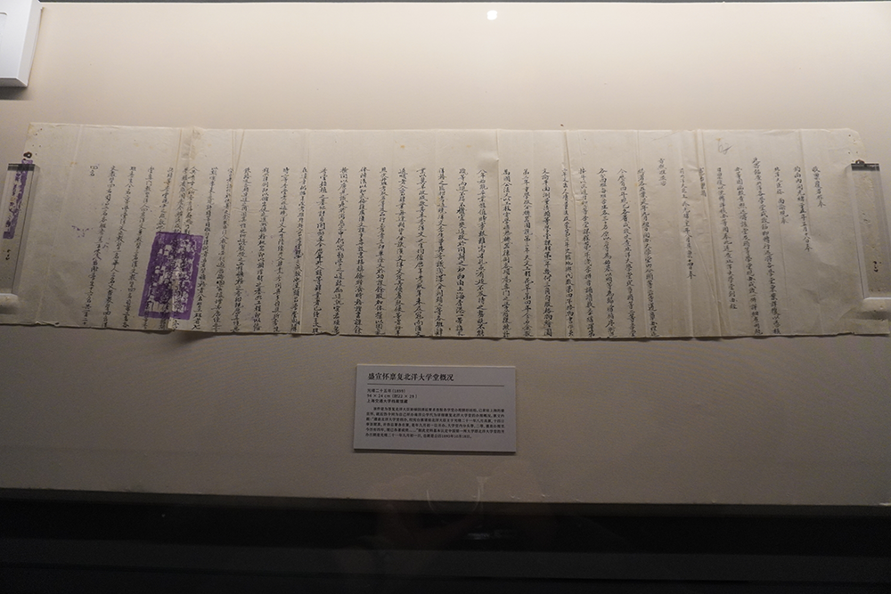 展品中,包括中国近代高等教育起点性文献——《盛宣怀禀复北洋大学堂开办概况》(光绪二十五年,1899年)。该件藏于上海交通大学档案馆,是盛宣怀就清廷要求查报各学堂办理成效一事,答复北洋大臣裕禄的禀文。已常驻上海的盛宣怀,就近饬令南洋公学代为详细回复北洋大学堂的办理概况。禀文内载:“遵查北洋大学堂创办,经宪台禀请前北洋大臣王于光绪二十一年八月具禀,十四日奉旨照准,并咨总署各在案,是年九月初一日开办。”据此史料基本可以认定中国第一所大学即北洋大学堂的开办日期是光绪二十一年九月初一日,也就是公历1895年10月18日,这一天是中国近代高等教育的起点。