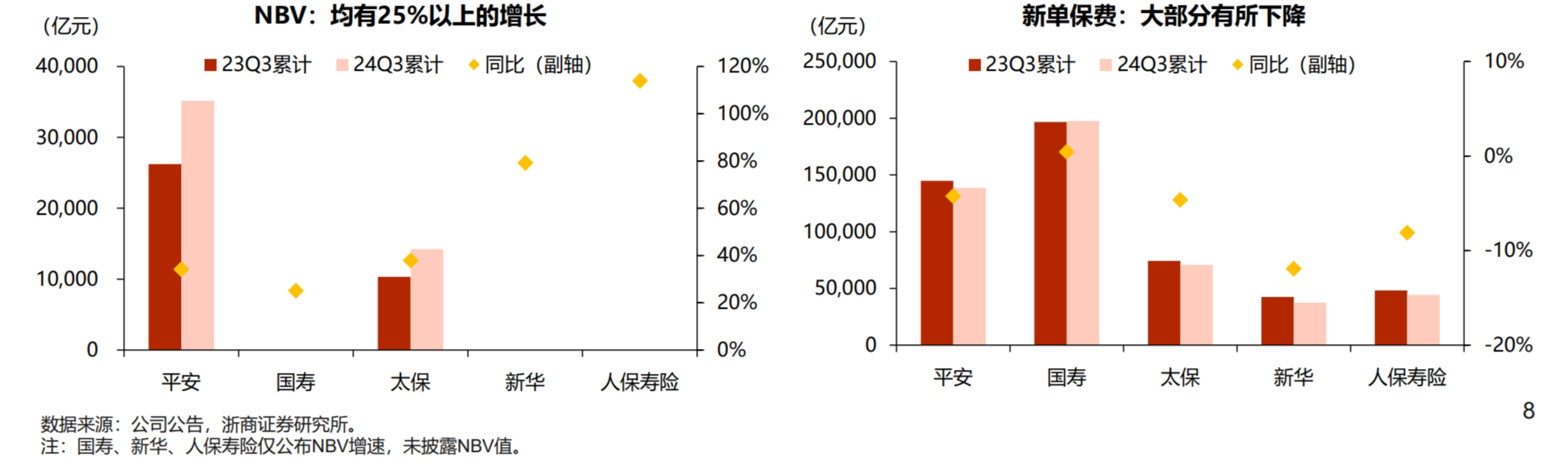根据浙商证券对保险行业三季报研报综述,新业务价值方面,今年三季度,保险预定利率再次下调,各险企积极进行停售运作,大力提升销售,各家NBV(新业务价值)均实现了25%以上的快速增长,人保寿险实现翻倍以上的增长,2024前三季度累计同比增速具体为:人保(113.9%)>新华(79.2%)>太保(37.9%)>平安(34.1%)>国寿(25.1%)。