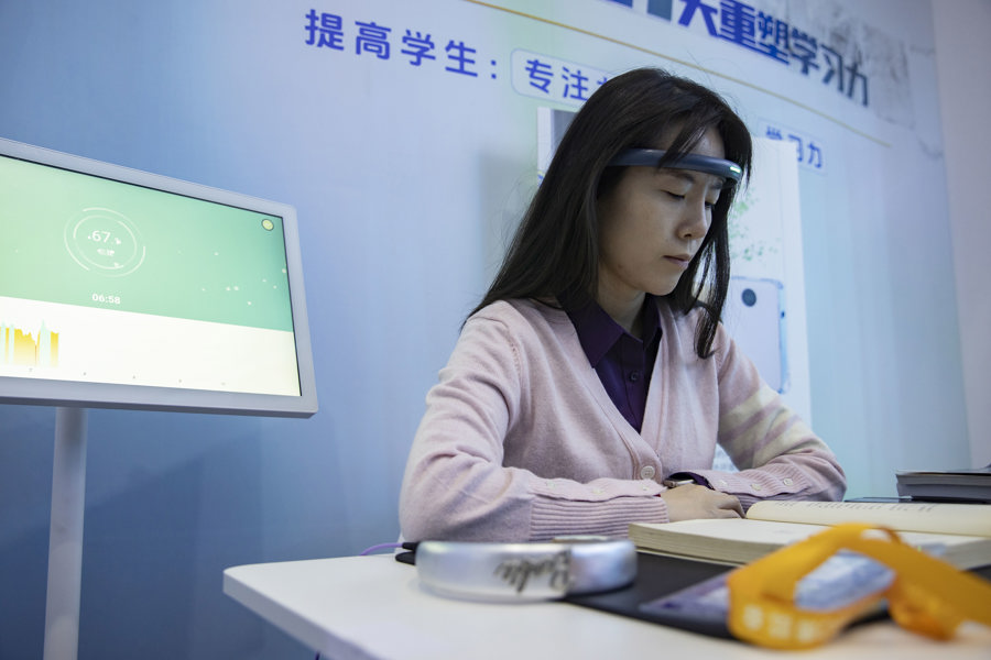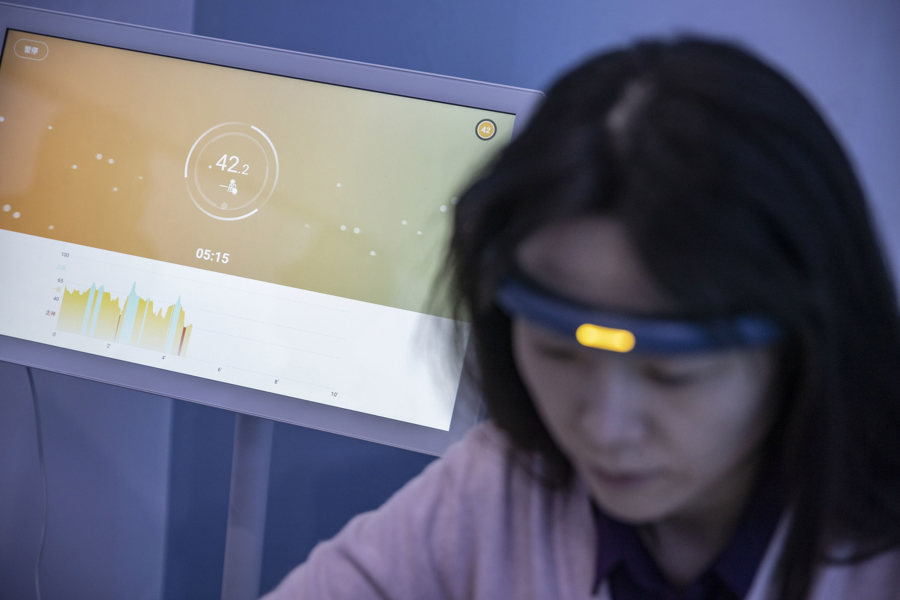 体验者在体验艾纳诗科技推出的幸福脑压力管理系统,这款系统是针对青少年人群,可以在睡眠的场景中帮助青少年在同样的时长之内有更多的深度睡眠,帮助青少年日常舒缓压力、提升专注力。