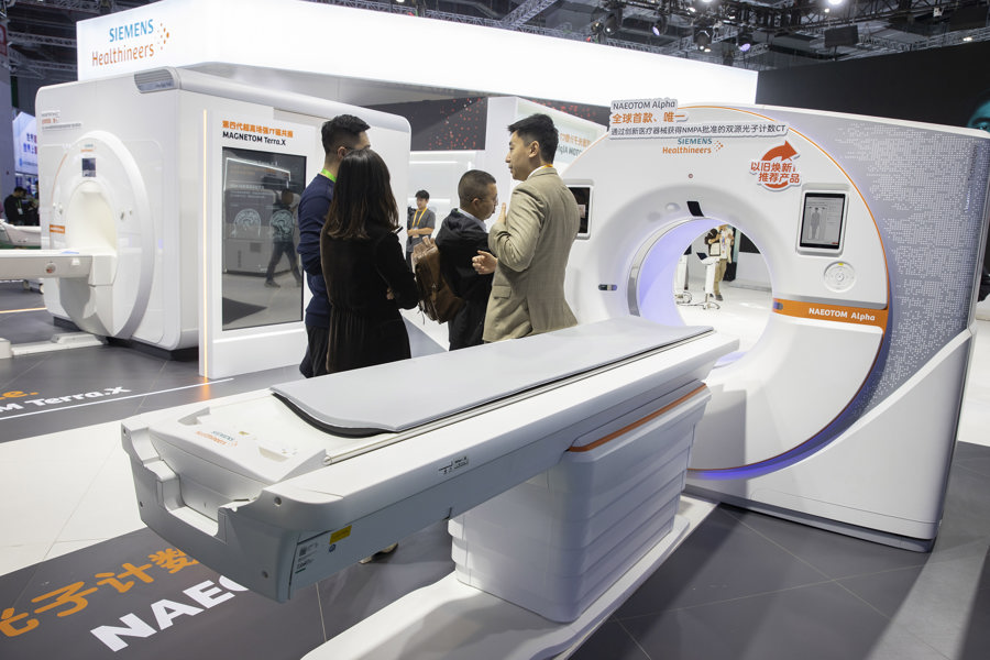 在西门子展区,工作人员向观众介绍西门子双源光子计数CT。西门子医疗光子计数CT首次将碲化镉(CdTe)这种新型半导体作为光子计数CT探测器的材料,使得X线剂量效率得到成倍提升,实现了CT检查辐射剂量大幅降低,空间分辨率提升、达到微米级,提高了图像质量,为疾病的“早诊早治”提供了新的利器。