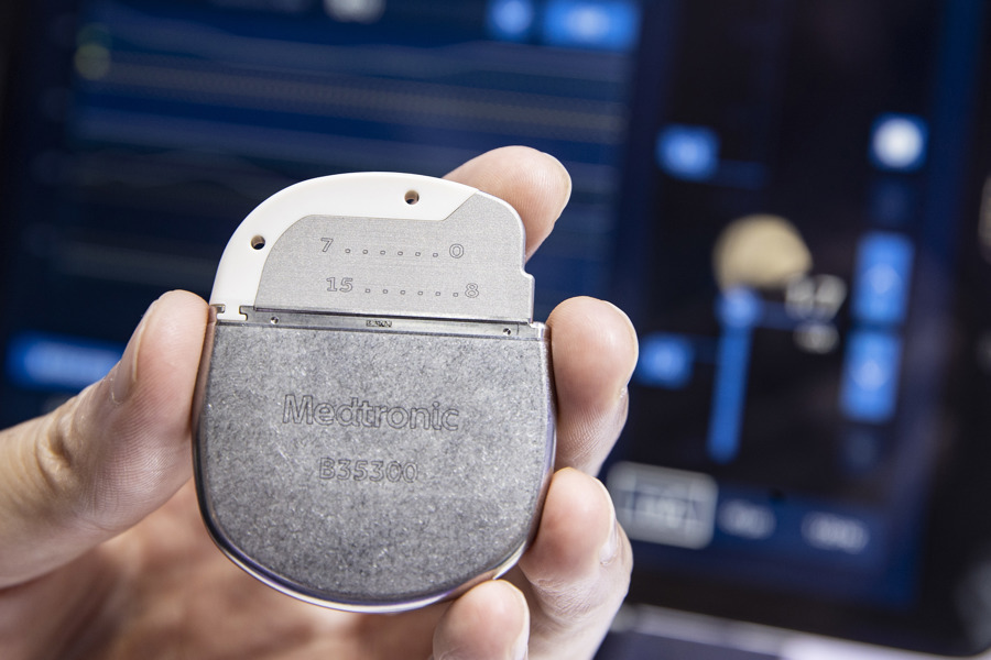 美敦力工作人员在展示Percept RC配备的穿戴式充电装置。