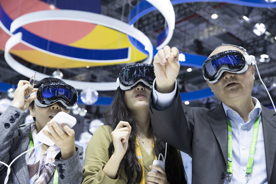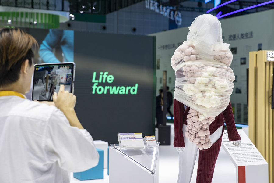 在诺华展区,观众佩戴VR眼镜体验放射配体疗法的工作原理和过程。自2018年参加首届进博会以来,诺华已有多款创新药及适应证在国内获批,全球首创小干扰RNA降胆固醇药物乐可为(英克司兰钠注射液)也是进博会“溢出效应”的获益者,已成功从“首秀展品”走向临床应用,为科学、长期的血脂管理提供了更多元的临床解决方案。