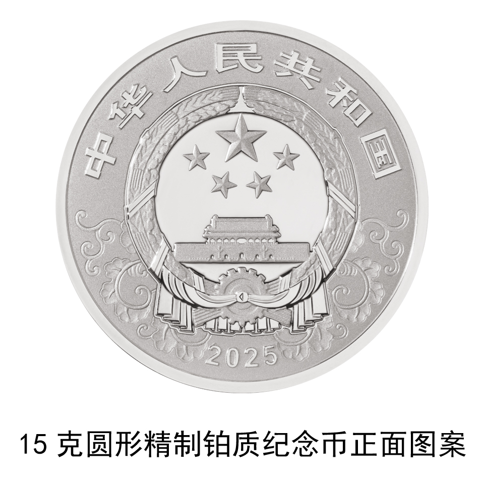 15克圆形铂质纪念币为精制币,含纯铂15克,直径27毫米,面额500元,成色99.9%,最大发行量10000枚。