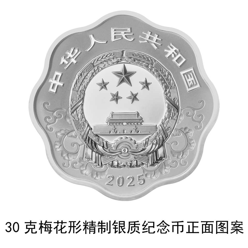 30克梅花形银质纪念币为精制币,含纯银30克,外接圆直径40毫米,面额10元,成色99.9%,最大发行量60000枚。