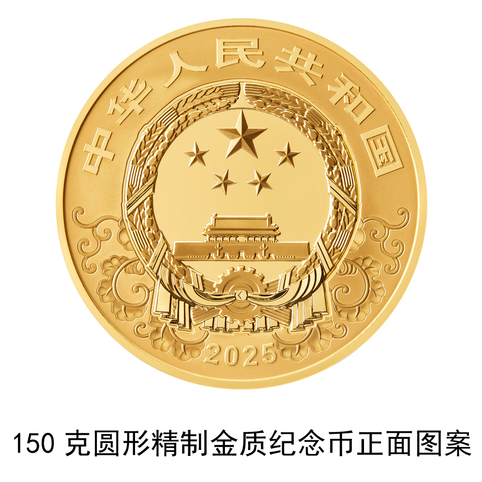 150克圆形金质纪念币为精制币,含纯金150克,直径60毫米,面额2000元,成色99.9%,最大发行量1000枚。