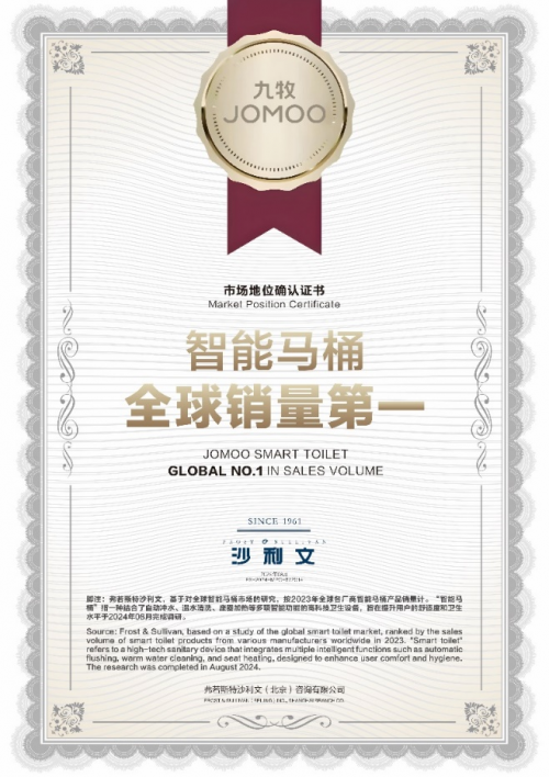 日前,全球领先的企业增长咨询机构弗若斯特沙利文(Frost & Sullivan,简称“沙利文”),基于对2023年全球智能马桶企业销量的市场调研,经过公平、公开、公正、权威、深入的分析和论证,显示中国九牧集团在全球智能马桶销量方面位列第一,并最终确认九牧集团“2023年智能马桶全球销量第一”的市场地位!这不仅是九牧作为“中国第一 世界前三”的行业地位再度巩固,也标志着九牧在智能马桶这单一品类上的遥遥领先,再次展示了中国九牧的强大实力和超前布局!