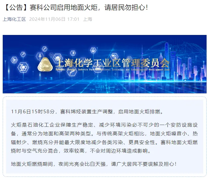当天下午,上海化学工业区管理委员会发布公告称“赛科公司启用地面火炬,请居民勿担心。”