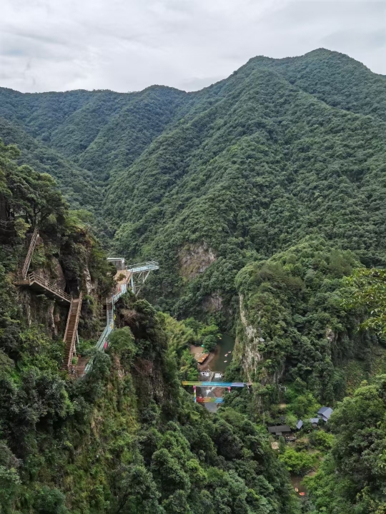 真的到了山顶,豁然开朗。成片成片的山脉素描成一幅水墨丹青,空山新雨后,跃动的云雾像个孩子在山体之间画着休止符。玻璃栈台下的磅礴和空灵,诠释了蜀道浪漫主义色彩的回归。山顶还有一个小卖部,破旧的音响里放着《我和我的祖国》,响彻了整个山涧和云端。这又有了一种庆幸,没有打退堂鼓,因为“快一些”,我们领略到了祖国的大好河山,这是身体的淬炼,更是意志的洗礼。