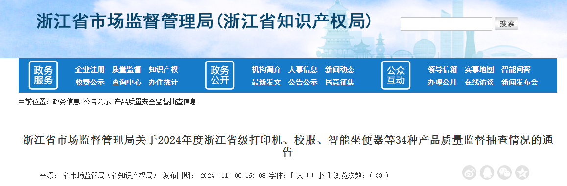 浙江公布2024年度省级打印机、校服、智能坐便器等34种产品质量监督抽查情况