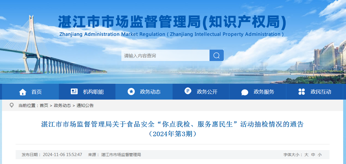 湛江市市场监督管理局关于食品安全“你点我检、服务惠民生”活动抽检情况的通告(2024年第3期)