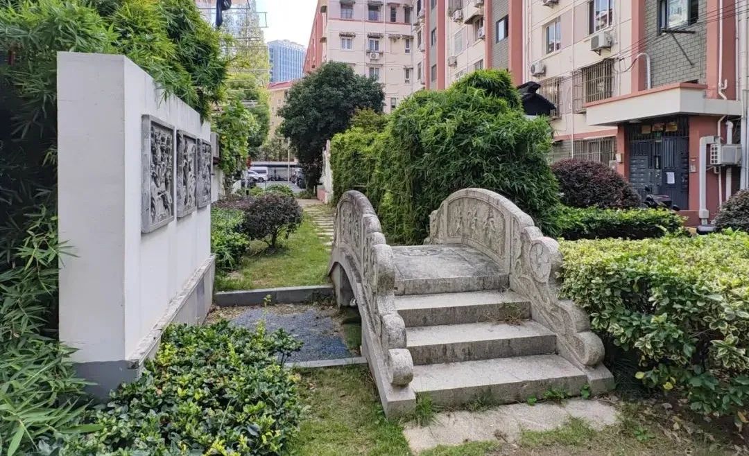 “梦谐桥”是虹储小区的“民心十景”之一。一座古朴的石桥掩映在苍翠的绿竹中,石板路旁屹立的白墙黛瓦镶嵌着精巧的窗棂,给小区增添了古色古香的氛围,使小区的环境更加富有层次。