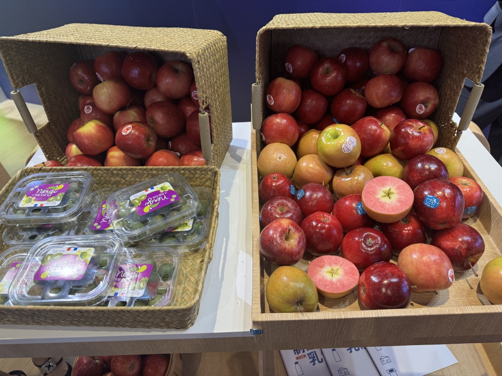 “此外,本次进博会我们特意从法国空运了7种共1000公斤的苹果,其中的明星产品就是这款法国‘红’苹果‘天使之吻’(Kissabel)。”李蓓表示,“它的特点是黄皮粉肉,看上去像桃子,但吃上去酸酸的像香槟。同时,它也因为纤维素高、糖度较一般苹果低,特别适合孕妇食用。”