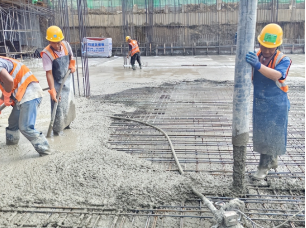 凝心聚力“攻坚堡垒”。项目部组建“党员突击队”、划分“党员责任区”,充分发挥党员先锋模范作用,先后克服了地下溶洞和老旧基础等不利地质条件的技术难题,100天完成了桩基与围护工程,取得良好开局。施工中,各部门协同联动,通过采取“夜间带班+挂图作战+人员全覆盖”方式,24小时3班轮岗,100天冲出“正负零”,85天完成第一栋楼结构封顶,充分展示了“中建速度”。