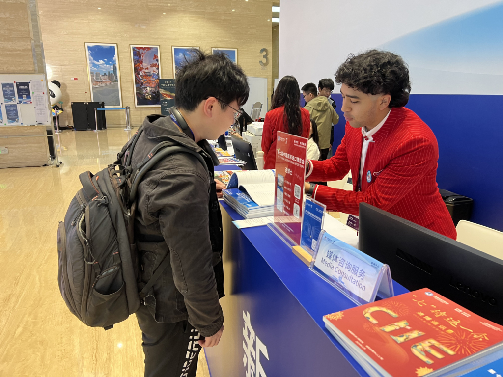 阿荣告诉澎湃新闻记者,今年是他第二年来进博会当志愿者,去年他在上海馆负责综合接待工作,今年来到新闻中心,主要工作还是咨询接待工作。
