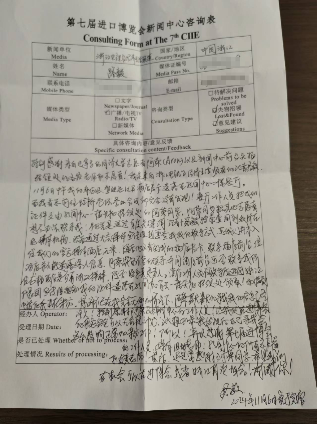 找寻的过程让阿荣花费了不少时间。他先是通过网络搜索功能,查询到路毅是一名媒体人;又通过发布过的新闻报道,找到了路毅所在的媒体机构。阿荣想通过进博会媒体宣传组,查找路毅的联系方式,但没有成功,随后又根据路毅遗留的酒店房卡,联系到酒店前台。阿荣说,通过酒店前台,询问该酒店是否有其他的浙江媒体记者,能否联系媒体代表团负责人。