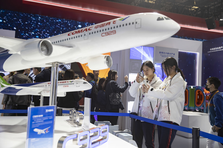 两位姑娘在中国国家馆参观C929大飞机模型。