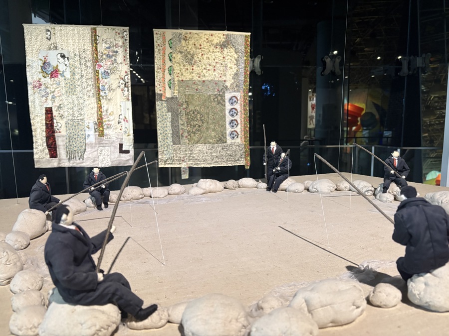 在计文于和朱卫兵的《这里的鱼不缺食物》等软雕塑装置作品群中穿梭,可遇见日常生活中提炼出的戏剧化场景。《用棉绳把塌了的墙重新建起来》探讨现代性进程对传统与地方性的冲击,反思其对人们生活空间与精神世界的侵蚀。