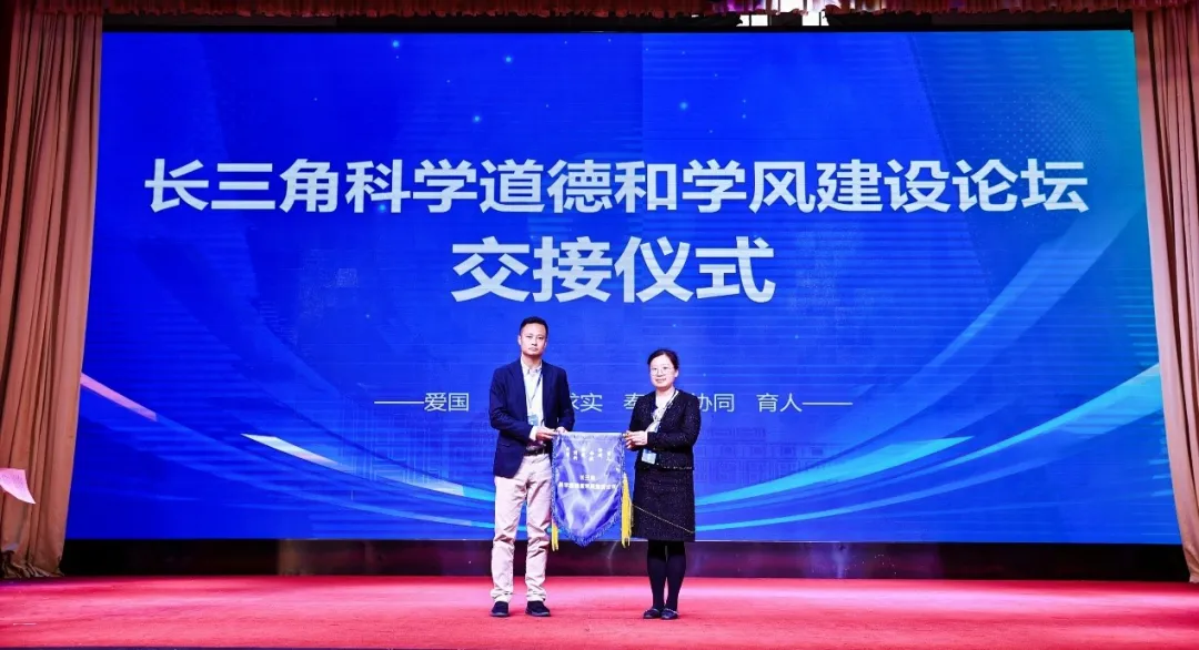 2025年长三角科学道德和学风建设论坛将由上海交通大学承办。上海理工大学党委研究生工作部副部长王张琦将论坛旗帜交接给上海交通大学学生处副处长范翔。
