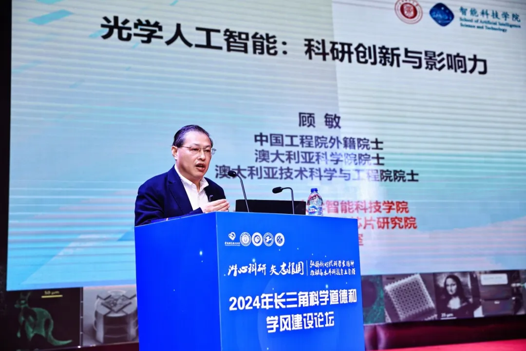 中国工程院外籍院士、上海理工大学校务委员会执行主席、光子芯片研究院院长顾敏作《光学人工智能——科研创新与影响力》主旨报告。报告中,他以澳大利亚的创新成果和上海理工大学光子芯片研究院的科研发展历程为例,强调了科研创新的重要性,指出了研究生培养中的创新、工业界合作的重要性和研究为社会带来的影响力。进而详细讲述了国内外科学家们如何探索突破光学成像衍射极限的方法及相关技术在光学成像、信息存储和芯片方面的巨大潜力,展示了光子在人工智能领域的应用前景和光学人智能对未来发展的影响。