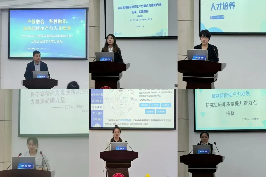 “产教融合科教融汇加快新质生产力人才培养”分论坛在上海工程技术大学松江校区举行。论坛邀请了2024年长三角科学道德和学风建设论坛中新质生产力人才培养相关主题论文的获奖代表进行了分享。来自华东政法大学、上海大学、上海工程技术大学等高校获奖师生代表参加了会议。与会嘉宾分享了他们在新质生产力人才培养领域的研究成果,并就科学家精神与研究生人才培养等实践探索方面展开了深入研讨。