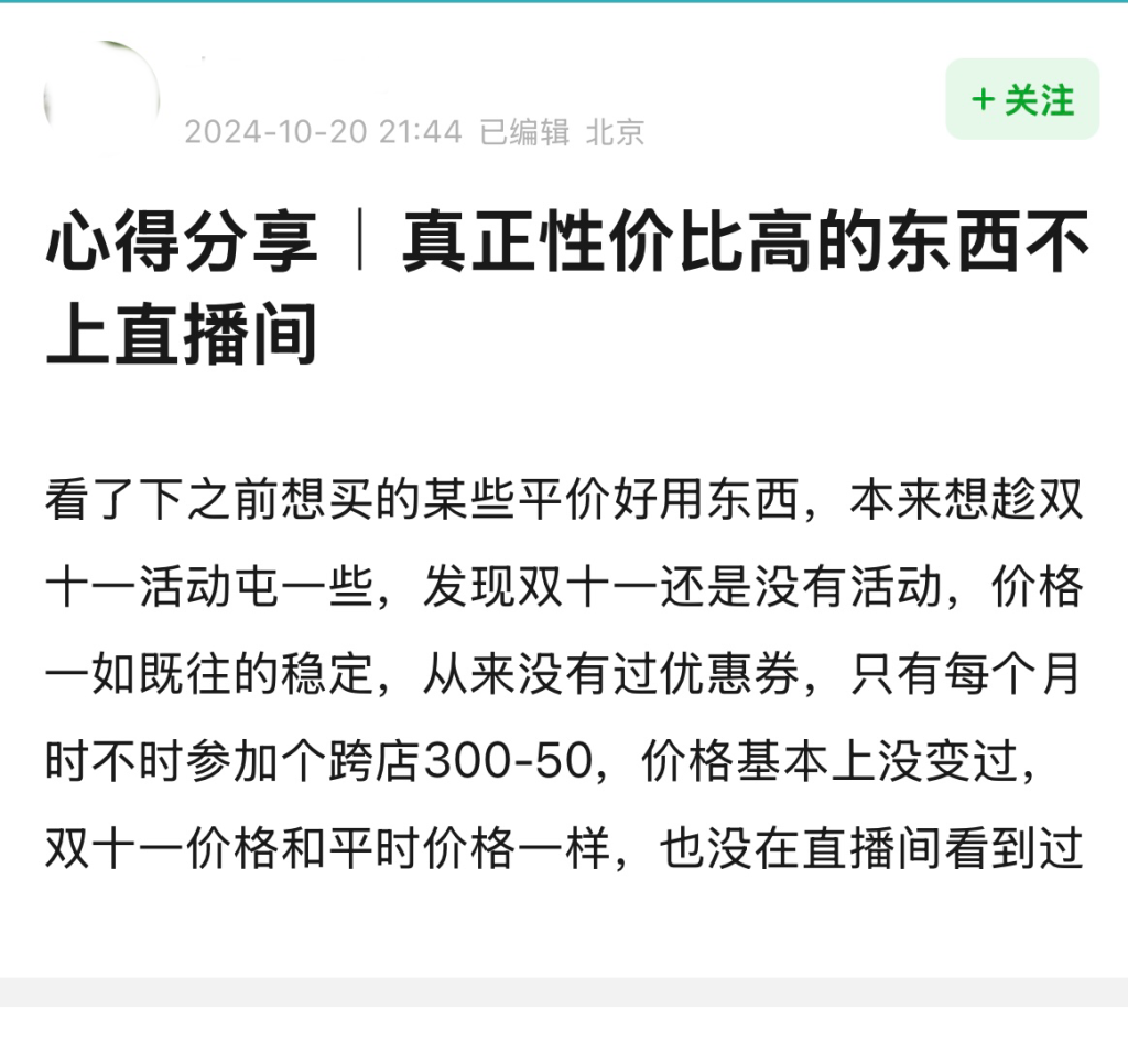 和琳琳不同,刘敏离开直播间的原因是受够了真真假假的低价,以及意识到时间成本的重要,她在2019年接触直播短视频,2020年跟随喜爱的主播下了第一单,今年双11却“偃旗息鼓”。