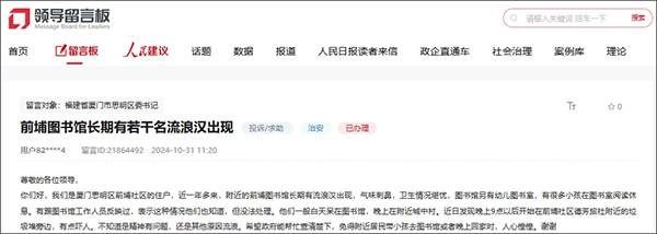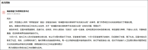 对此,11月8日,福建省厦门市思明区委书记账号回复表示,厦门市思明区文化和旅游局进行了调查处理。接到诉求后,区图书馆高度重视,迅速行动,经核实,诉求人提到的“流浪汉”也是一位读者,经常在固定时间来到前埔分馆,有轻度智力障碍,不擅与人交流,形象稍显邋遢,但没有影响其他读者阅读的行为。