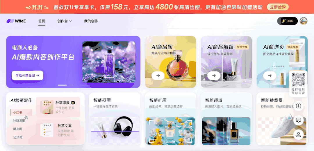 每逢店铺上新、节点大促期间,商家对于营销海报和营销文案的需求量井喷,在人力有限的情况下,如何解决营销素材单一、内容同质化严重等痛点?WIME上线「AI商品海报」生成及「AI营销写作」功能,支持多渠道、多尺寸、多平台图文素材一键生成,提升效率,释放人力,助力电商人解决更复杂的经营问题。
