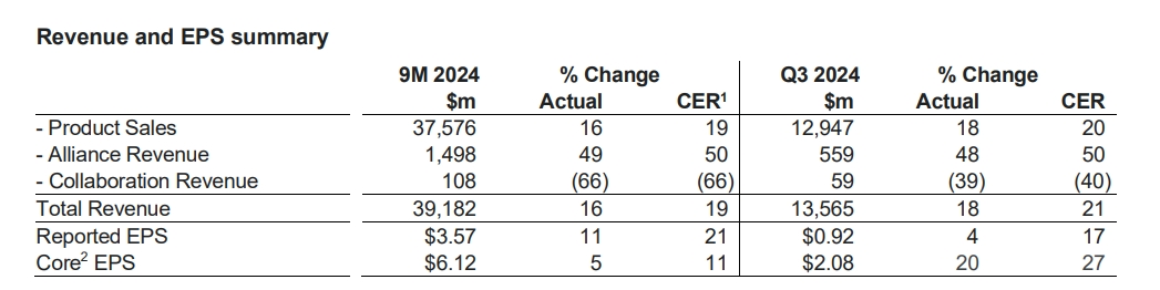11月12日,阿斯利康公布2024年三季报。第三季度收入135.65亿美元,同比增长(按固定汇率计算,以下同)21%,核心每股收益2.08美元,同比增长27%;前九个月整体来看,收入391.82亿美元,同比增长19%,核心每股收益6.12美元,同比增长11%。