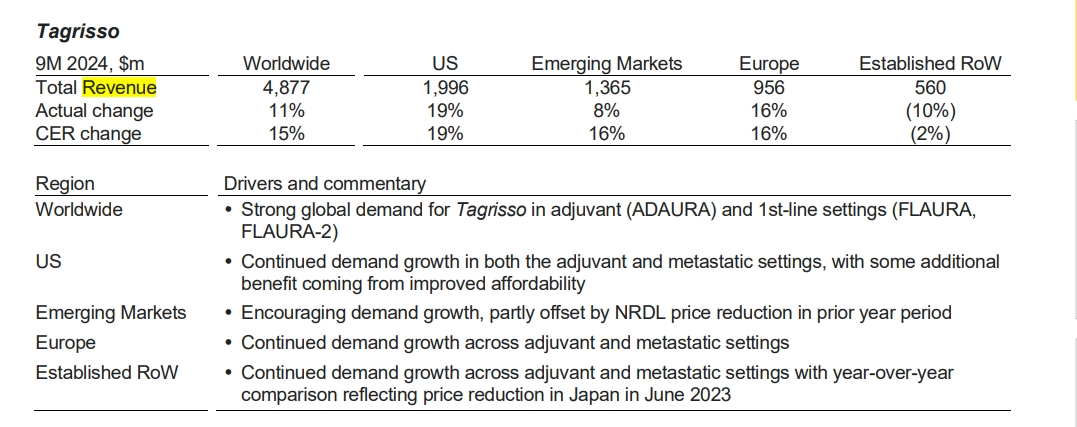 三季报显示,阿斯利康全球肿瘤业务前三季度收入160.09亿美元,第三季度收入55.69亿元,均同比增长22%。其中,Tagrisso(奥希替尼,中文商品名:泰瑞沙)是阿斯利康前三季度收入最高的肿瘤药物,达到48.77亿美元,同比增长15%;Imjudo(替西木单抗)前三季度收入2.08亿美元,同比增长32%,包括中国在内的新兴市场收入0.11亿美元;Enhertu(德曲妥珠单抗,中文商品名:优赫得)收入14.42亿美元,同比增长60%。