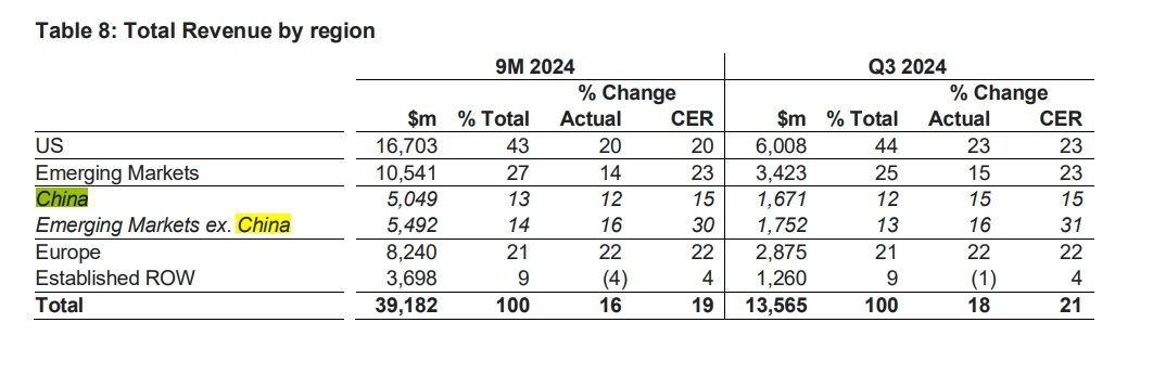 从国家来看,三季报显示,中国第三季度收入16.71亿美元,同比增长15%。前三季度收入50.49亿美元,同比增长15%。按此计算,中国占阿斯利康前三季度整体收入的比重约12.89%。