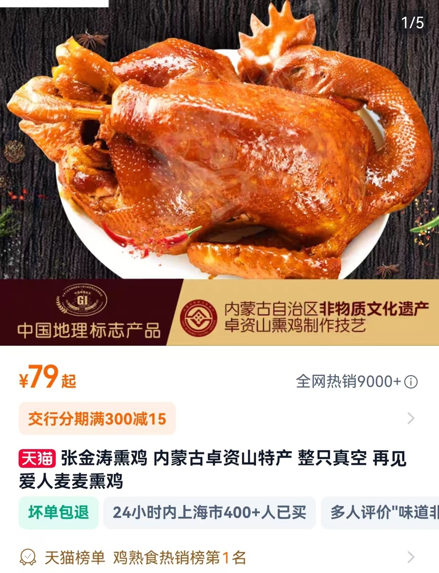 最终被扒出的内蒙古某品牌熏鸡登上双十一熟食热销榜第一,该品牌旗舰店也打出“再见爱人麦麦熏鸡”的字样营销。
