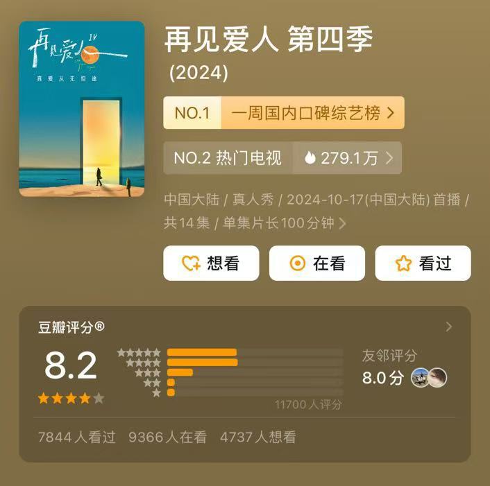 “我觉得综艺比所有电视剧都能切合当下时代情绪。长剧集的电视剧制作周期是2到3年,端出来的还是成品,整体也是追赶2到3年前的潮流。片方只能做宣发营销,通过解释,把2到3年前的作品解释成今天的,以弥合差距。”在她看来,许多影视剧售后中主演“合体-甜蜜-提纯”的营业方式,也可以看作一种“恋综”或者离婚综艺,《再见爱人4》尽管没有电视剧托底,但优势是导演会选择嘉宾,嘉宾的个人底色就像是某种程度的“电视剧”。而且它播出及时,观察员还会结合近期流行进一步挖掘话题点,“大家爱戏里,就想看戏外。离婚综艺一步到位,戏里戏外一体,而且还更接地气。”