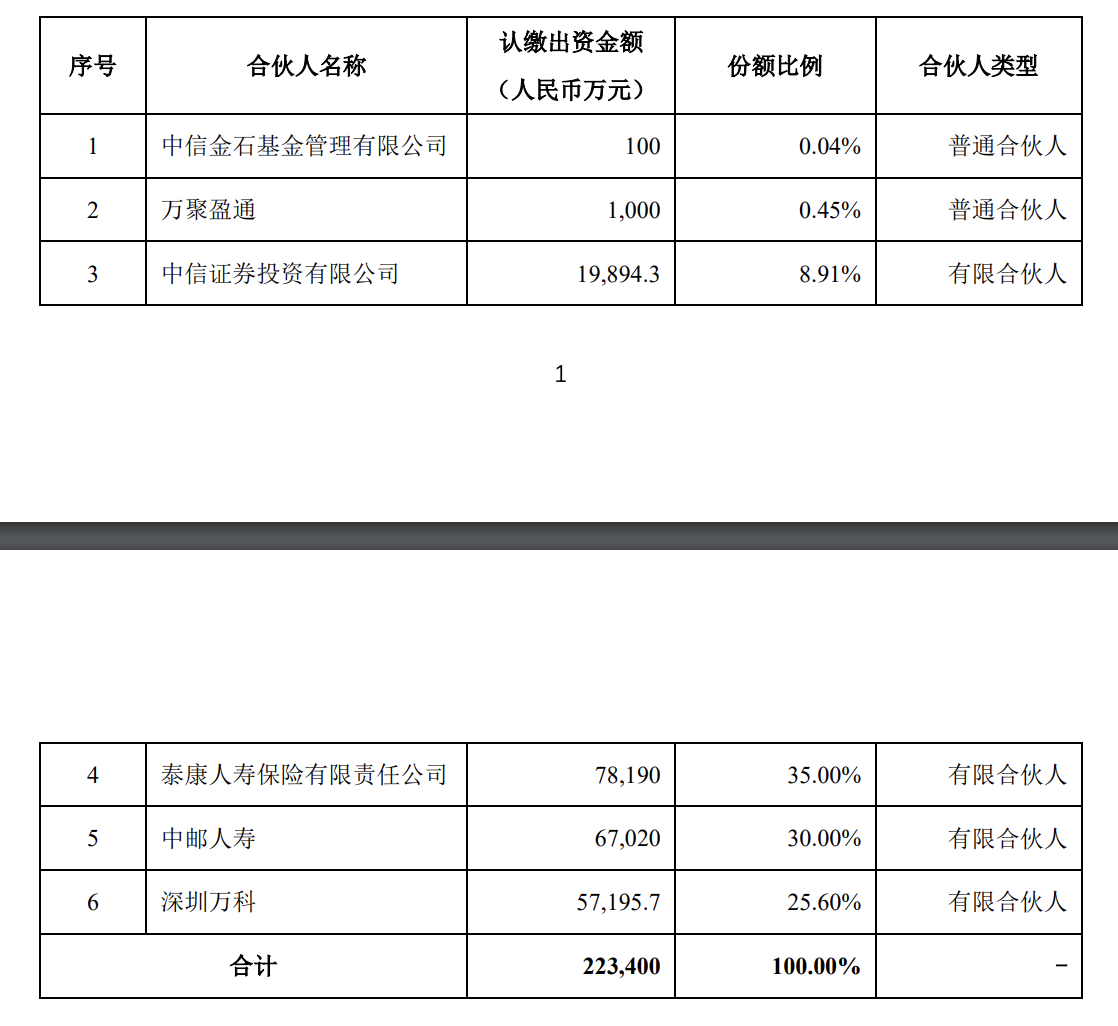 公告显示,万科下属子公司海南万聚盈通企业管理有限公司(简称“万聚盈通”,普通合伙人之一)、深圳市万科发展有限公司(简称“深圳万科”,有限合伙人之一)与中信金石基金管理有限公司(普通合伙人之一)、中信证券投资有限公司(有限合伙人之一)、泰康人寿保险有限责任公司(有限合伙人之一)签署了《万信金石(南京)商业投资合伙企业(有限合伙)有限合伙合同》(简称“《有限合伙合同》”),共同投资设立了“万信金石(南京)商业投资合伙企业(有限合伙)”(简称“中信万科消费基础设施基金”)。