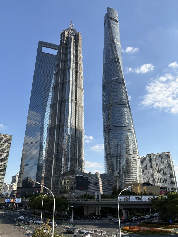 从陆家嘴环路的起点乘坐扶梯上到连廊,首先映入眼帘的是环球金融中心,也就是“三件套”中的“开瓶器”。一路往滨江方向走,会依次经过“注射器”金茂大厦、“打蛋器”上海中心,随后抵达国金中心。