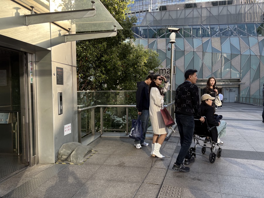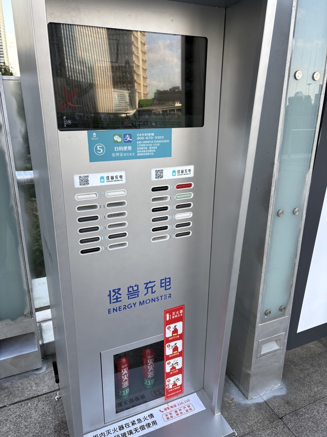 比如方便推轮椅或婴儿车的人使用的无障碍电梯,每个节点处都有。电梯处贴了温馨提示,正常运行时间为8:00-23:00,旁边还有个一体设备,上面是共享充电宝,下面是灭火器。