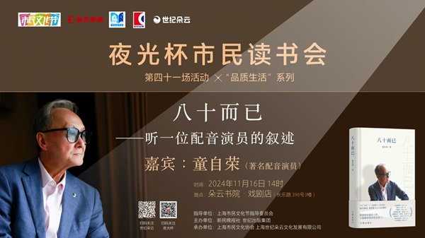 正如童自荣对自己这本书的评价:“我希望老百姓看了这本书能感到一点高兴,一点温暖,一点感动。”这也正是我们在不经意间追求的品质生活,正契合了今年夜光杯市民读书会的总主题“品质生活”。11月16日,在夜光杯市民读书会参与互动的读者,还将获赠童自荣新书《八十而已》或最新的夜光杯文萃《岁月未蹉跎》。本场活动由上海市民文化节指导委员会指导,新民晚报社、世纪出版集团主办,上海市民文化协会、上海世纪朵云文化发展有限公司承办。