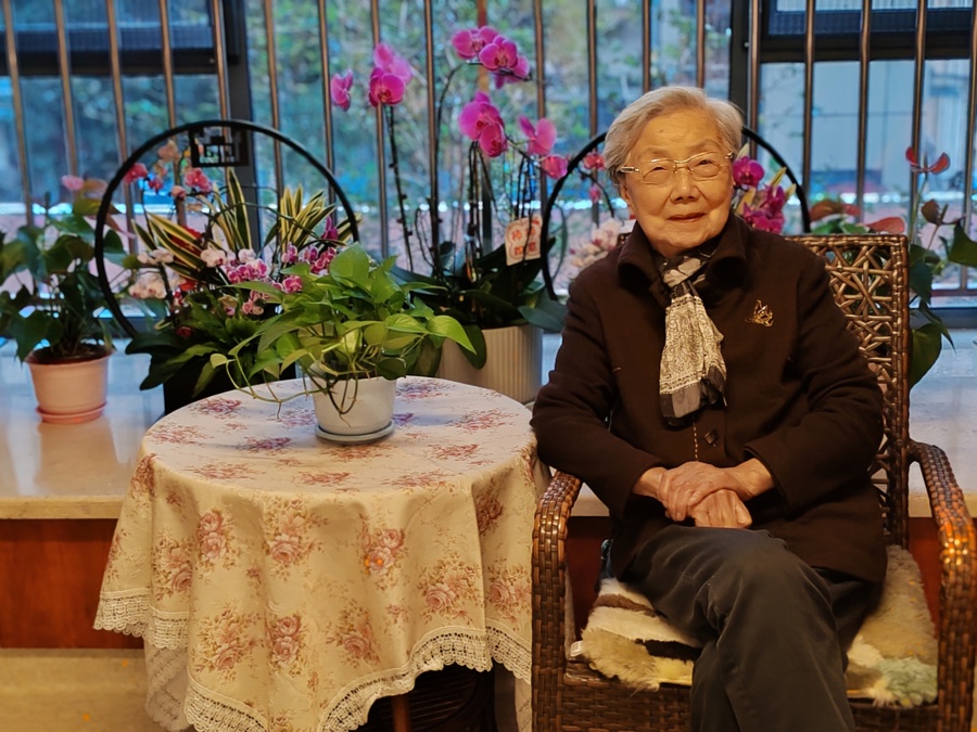 陈秀清今年90岁了,她戴一副眼镜,穿着得体、气质淡雅。陈秀清智能手机用得丝滑,会用微信聊天,是很独立的老太太。