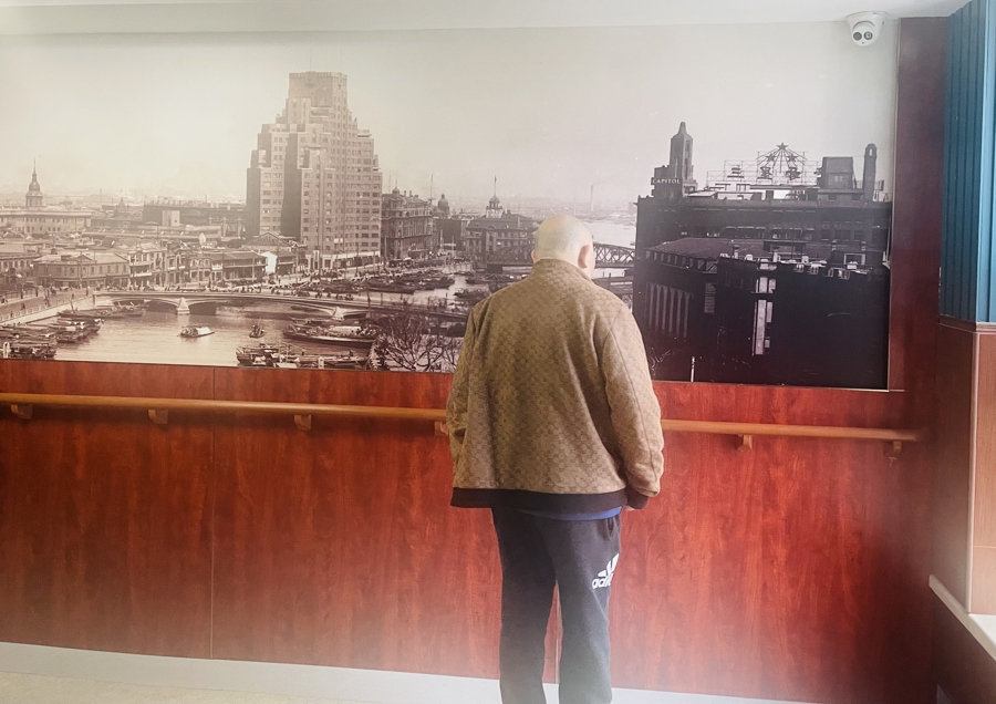 吃过午饭,延吉街道养老院一位老人在看墙上的老上海风情。 王海燕摄