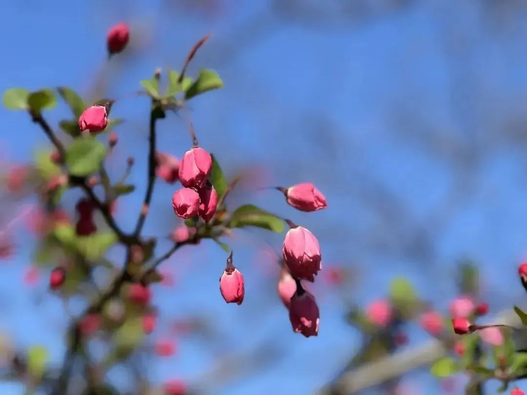 除了晚秋,早春也是欣赏垂丝海棠的重要时间。那时,垂丝海棠的嫩枝、嫩叶均为紫红色,粉红色的蓓蕾压着枝头微微下垂,吐露芬芳,风韵别致。垂丝海棠还有重瓣、白花等变种,整个家族的“颜值”都极高,色泽淡雅的花瓣层层叠叠,是春日里的小清新。