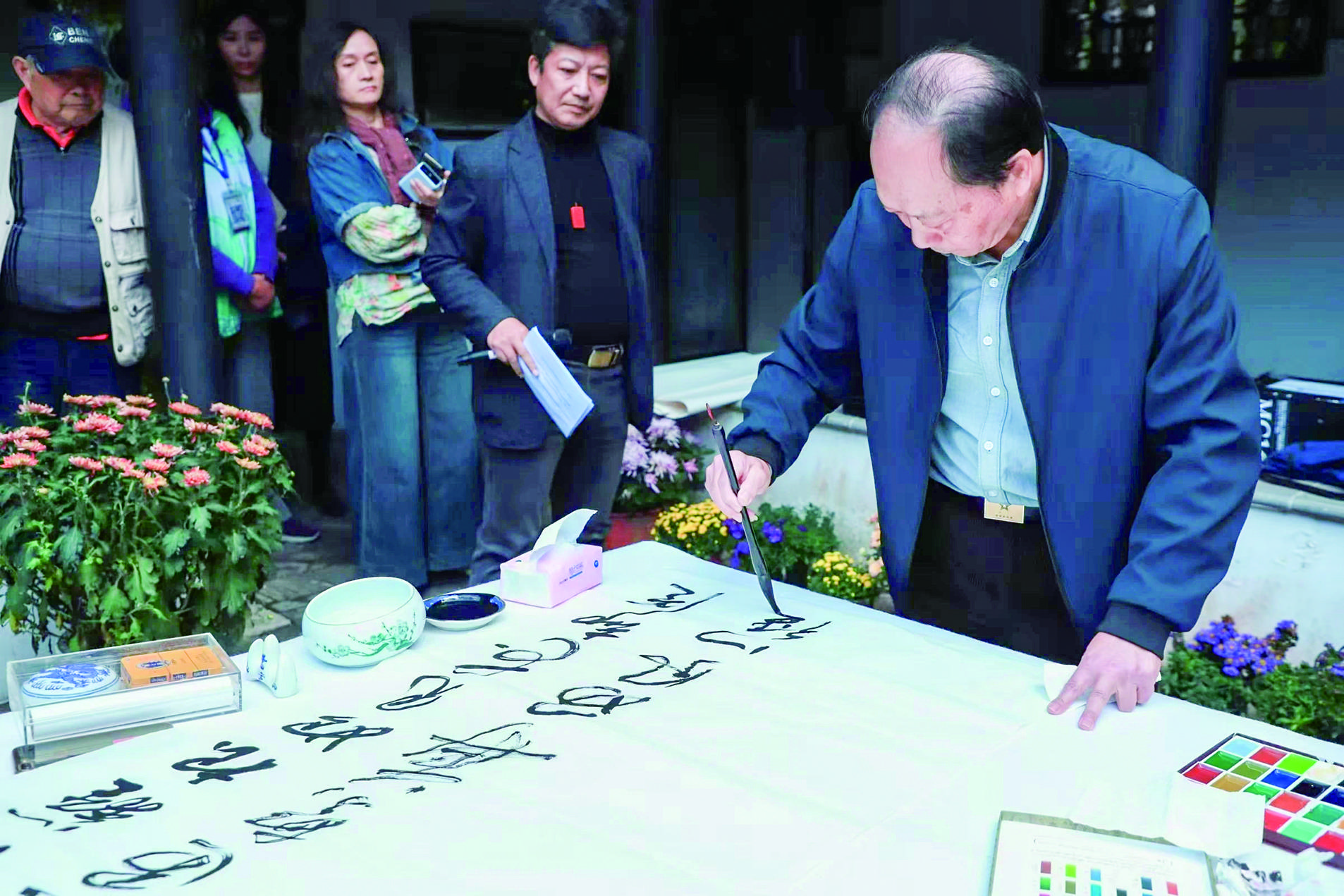 松江书法家盛庆庆在现场泼墨挥毫。