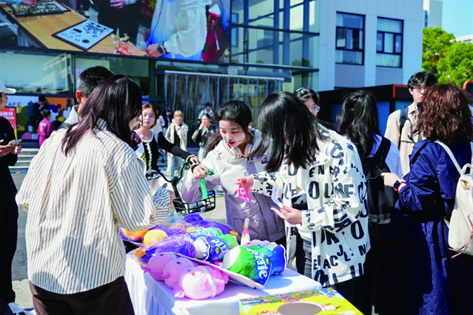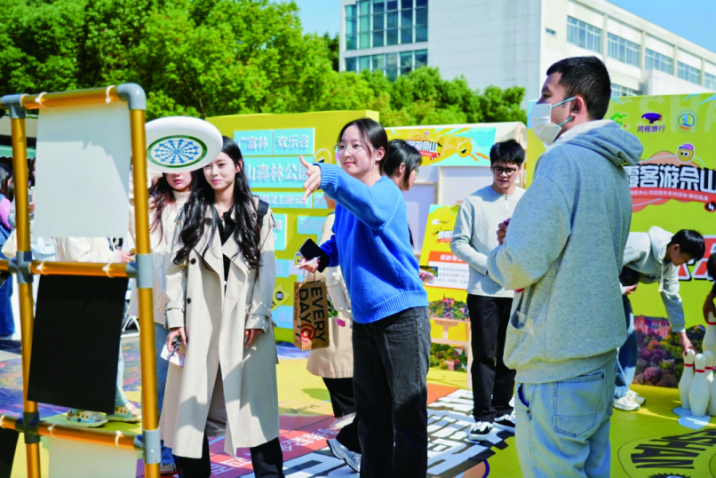 户外游戏区成为了路演的亮点之一,飞盘游戏和保龄球游戏激发了学生们的参与热情,大家纷纷排队挑战。在飞盘游戏中,同学们手持飞盘,瞄准目标,奋力一掷,每当成功击中目标,都会引来欢呼和掌声。保龄球游戏区同样受到欢迎,大家在指定距离处,用尽全力将保龄球掷出,每当看到球瓶应声倒下,不少学生露出“成就感”满满的笑容。集章抽奖环节更是将现场气氛推向了高潮,大家兴奋地展示自己的集章卡,期待着能够抽取到佘山国家旅游度假区的文创产品。