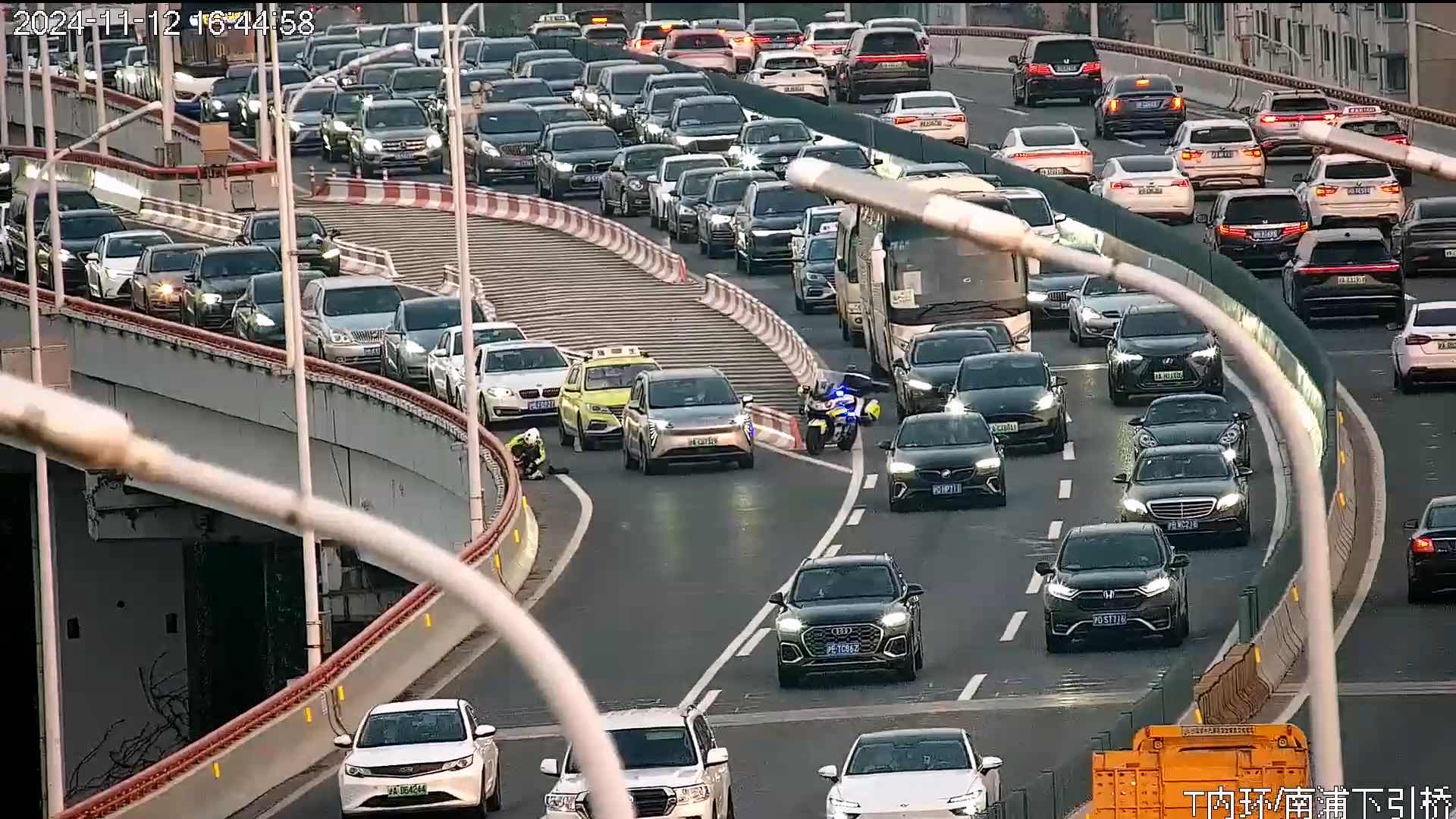 11月12日16时32分许,上海市公安局浦东分局交警支队指挥室在晚高峰道路巡查过程中,发现在南浦大桥杨高南路匝道上正有一名男子徒步往高架上行走,立即指令浦东交警支队铁骑中队民警前往处置。